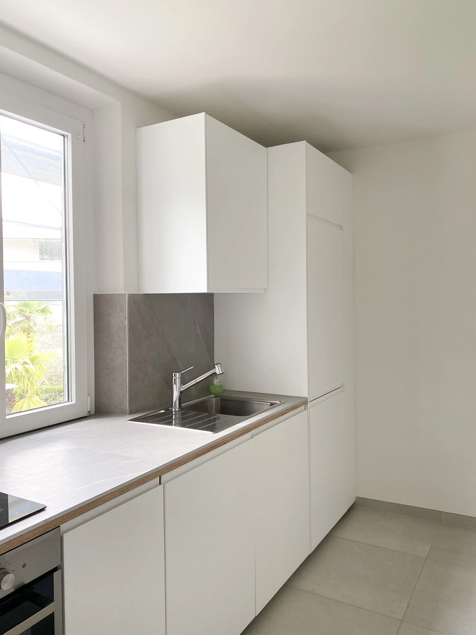 Ein kleines Bad mit Dusche und viel Tageslicht. Bei Bedarf steht auch eine Waschmaschine zur Verfügung.